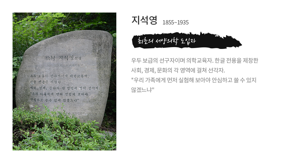 우두 보급의 선구자이며 의학교육자. 한글 전용을 제창한 사회, 경제, 문화의 각 영역에 걸쳐 선각자. "우리 가족에게 먼저 실험해 보아야 안심하고 쓸 수 있지 않겠느냐"