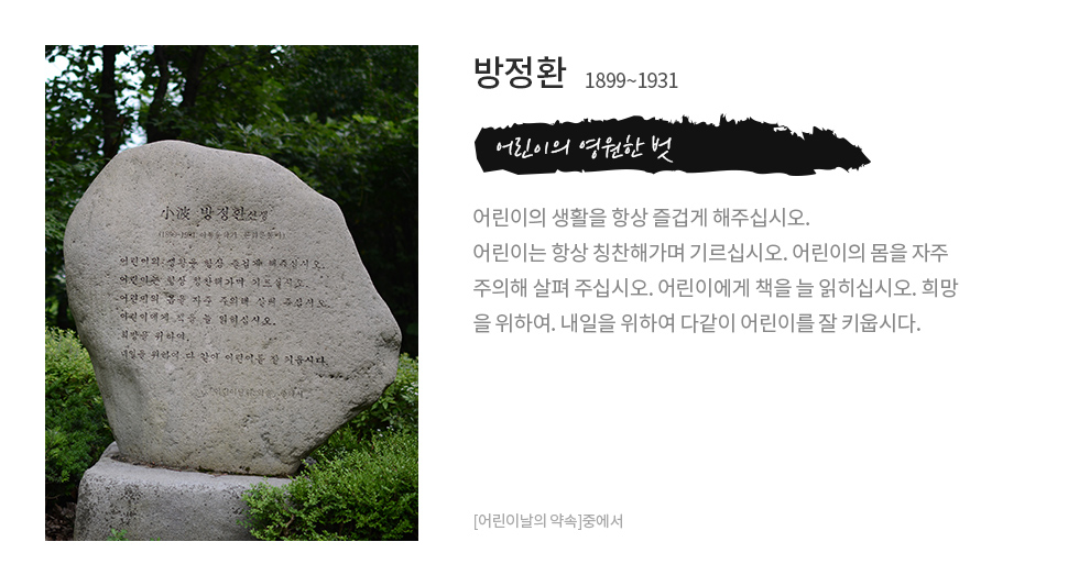 어린이는 항상 칭찬해가며 기르십시오. 어린이의 몸을 자주 주의해 살펴 주십시오. 어린이에게 책을 늘 읽히십시오. 희망을 위하여. 내일을 위하여 다 같이 어린이를 잘 키웁시다.