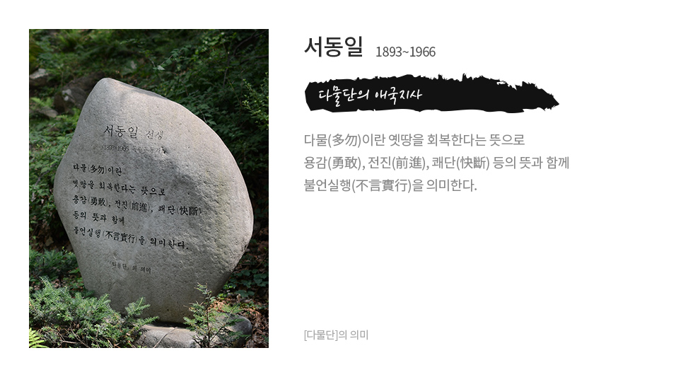 다물(多勿)이란 옛땅을 회복한다는 뜻으로 용감(勇敢), 전진(前進), 쾌단(快斷) 등의 뜻과 함께 불언실행(不言實行)을 의미한다.